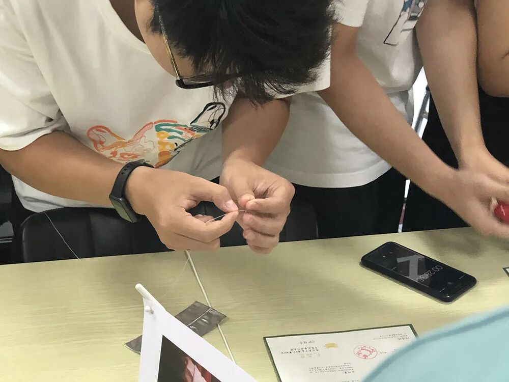 穿针乞巧,中国岁时风俗。古时七夕之夜,手执五色丝线和连续排列的九孔针趁月光对月连续穿针引线,将线快速全部穿过者称为“得巧”。展现了古代中国劳动人民的聪明才智和生活向往。本赛点需要在30秒内,完成穿不少于3孔针,在规定的时间内完成者,方可获得乞巧印章。