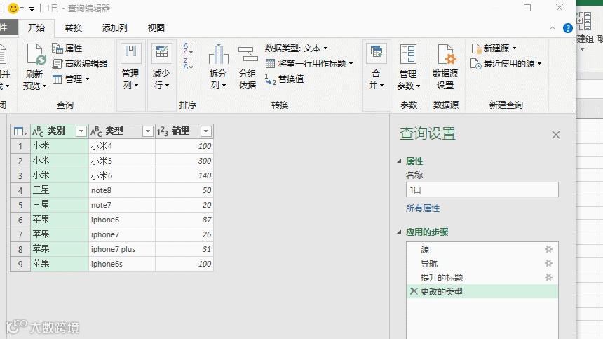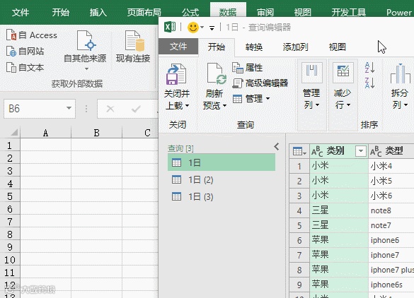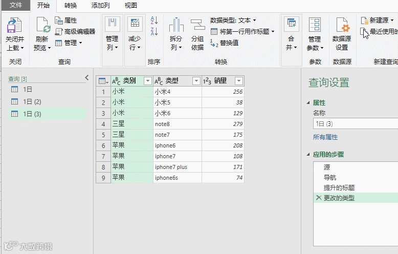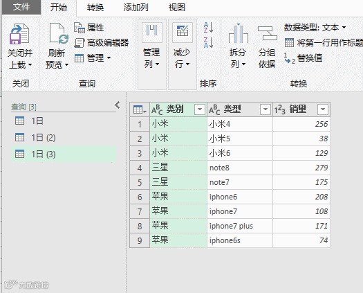 开始 - 合并 - 追加查询,在北京的数据(1日)后追加上海、广州的日报数据