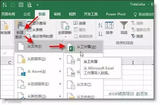 打开Total.xlsx文件 - 数据(10、13版power querry) - 新建查询 - 从文件 - 从工作簿。(如果要汇总的文件非常多或有子文夹,可以选“从文件夹”,但后续步骤完全不一样了,以后再做介绍)