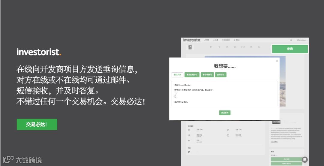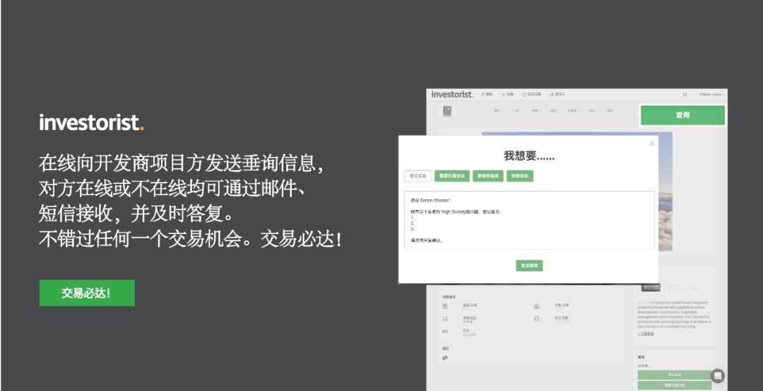 接下来,就是你的销售团队的线下销售环节了。一旦有客户感兴趣,你可以随时随地登录进去,在线向开发商预约登记意向,或是在线问答各类销售问题。平台有英文、中文、西班牙文多语种支持,跨越地域和语言的障碍。