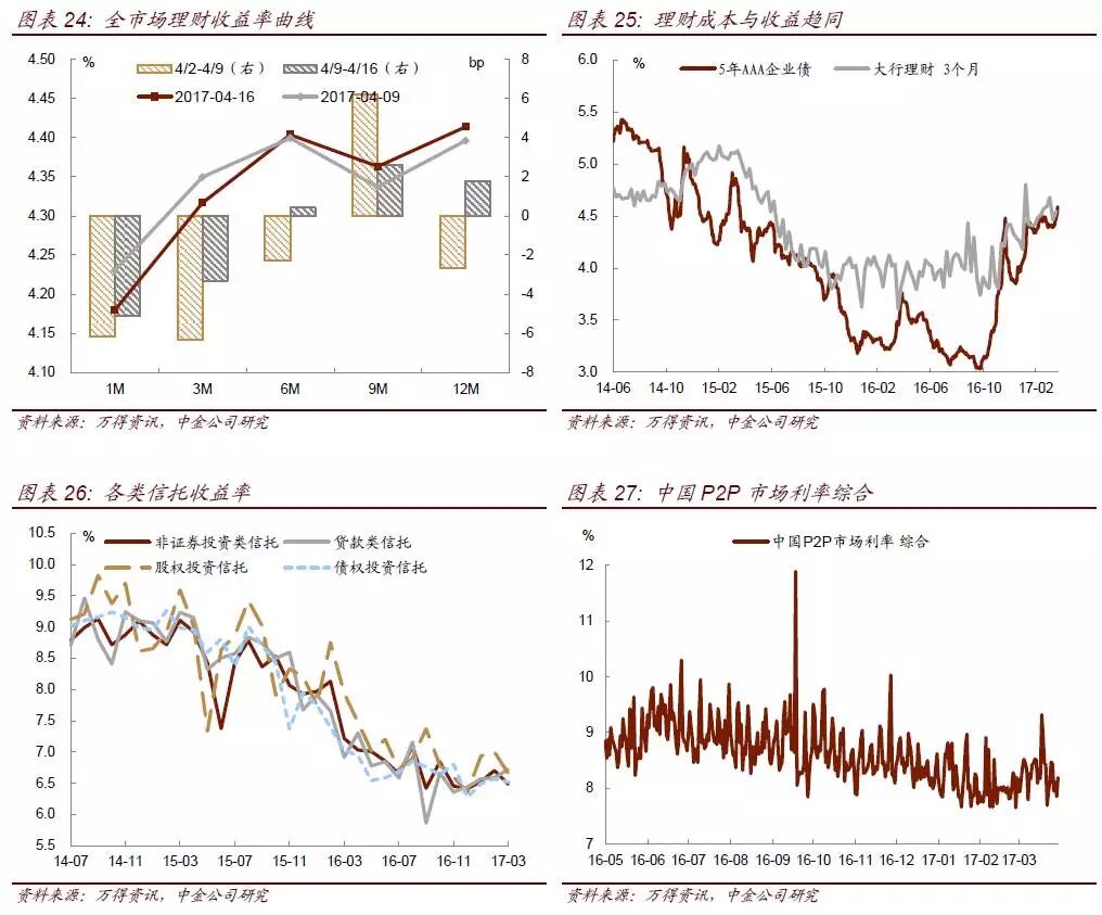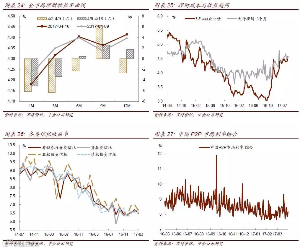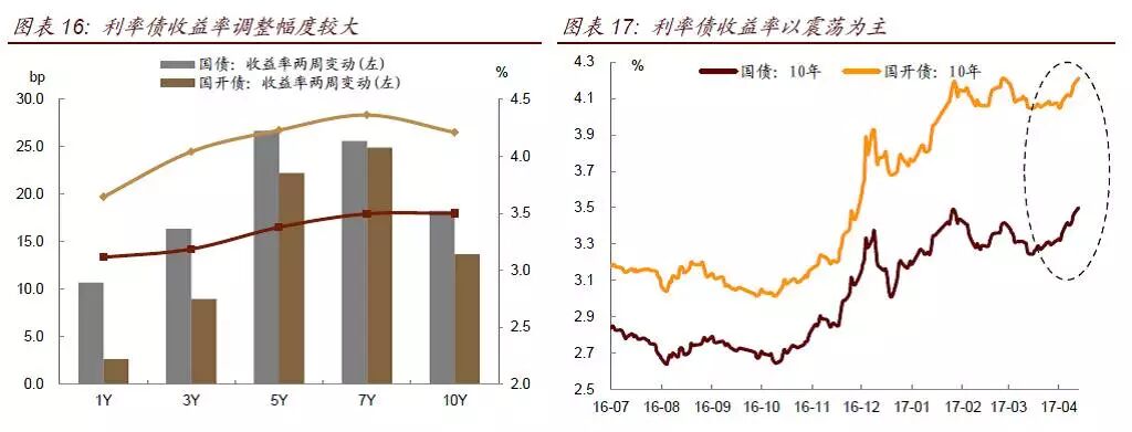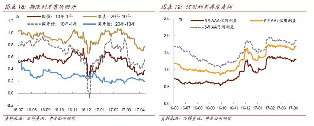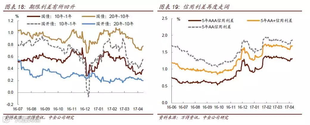 债券收益率在近两周经历了大幅调整,调整时间集中在4月中旬,银监会发布一系列监管文件。截至目前,利率债的调整幅度达到20bp左右,10年国债从月初的3.27%上行至3.50%,10年国开从4.05%上行至4.21%;信用债的调整幅度更大,调整幅度超过30bp,3Y期AAA中票从4月初的4.31%上行至4.66%,3年期AA+中票从月初的4.60%上行至5.0%,信用利差也随之走阔。