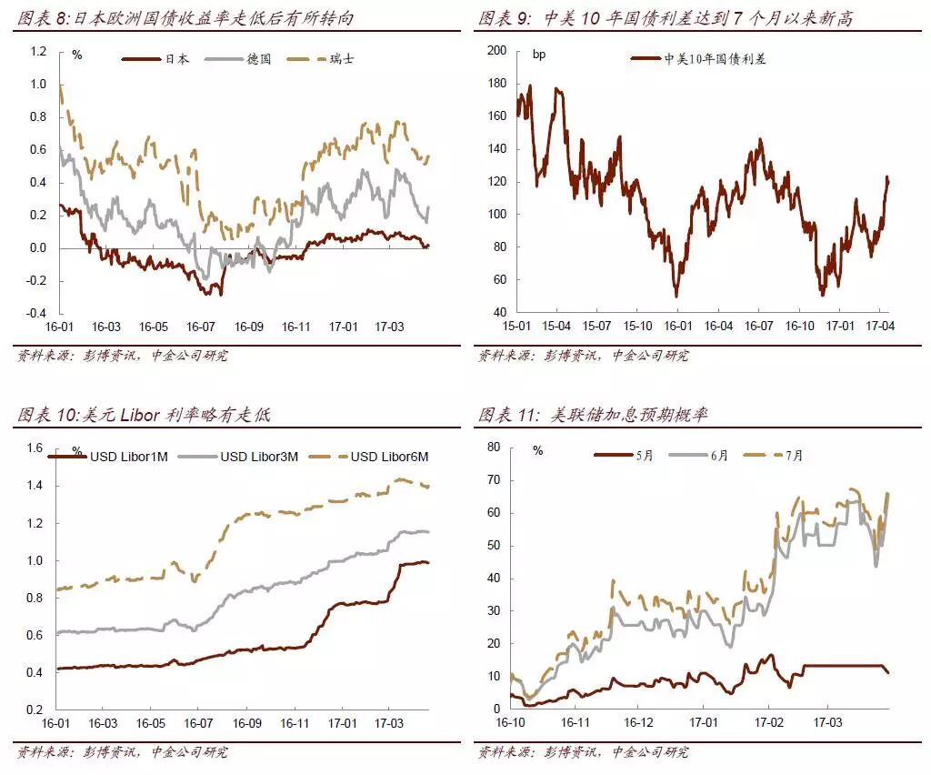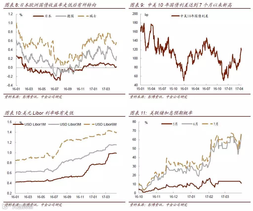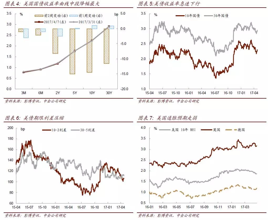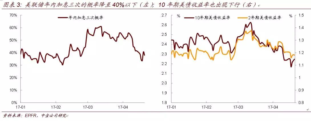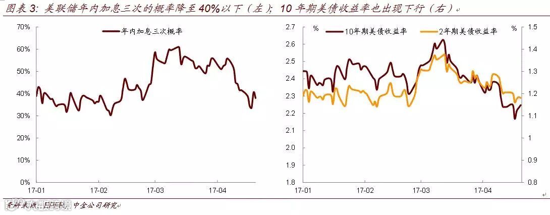 按照此前联储官员讲话和3月议息会议纪要内容,为了避免给市场造成较大的冲击,加息和缩表不会同时进行。受近期美国公布的一系列经济数据不及预期影响,3月以来市场对美联储的加息预期也开始下行。截至目前,联邦利率期货隐含的年内加息三次的概率已经降至38%,而3月时联邦利率期货隐含的加息三次概率仍高达60%。随着市场对美联储加息概率的预期下降,美债收益率也相应下行。虽然缩表本身会对长端收益率造成较大影响,但短期来看,受制于经济数据不及预期,加息进度或将受阻,而缩表在加息之后,长端收益率短期内受此影响不大。