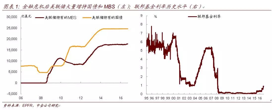 金融危机后,美联储总共实行了3轮QE。第一轮QE是从2008年11月至2010年3月,一共购买了1.725万亿的美元资产,包括1.25万亿美元的抵押贷款支持证券、3000亿美元的国债等;第二轮QE是从2010年11月至2011年6月,一共购买了0.6万亿的美国长期国债;第三轮QE是从2012年9月至2014年10月,共计购买了1.6万亿美元资产,每月分别采购400亿元的抵押贷款支持证券和450亿元的国债。虽然2014年10月美联储退出QE,但美联储并没有停止购买资产,而是把到期证券本金用于再投资,来保持资产负债表的稳定。经过三轮QE,目前美联储资产负债表的规模达到4.5万亿,其中持有的美国国债规模为2.46万亿,持有的MBS规模为1.78万亿。美联储占美国国债持有者结构的比重也上升至15.4%。