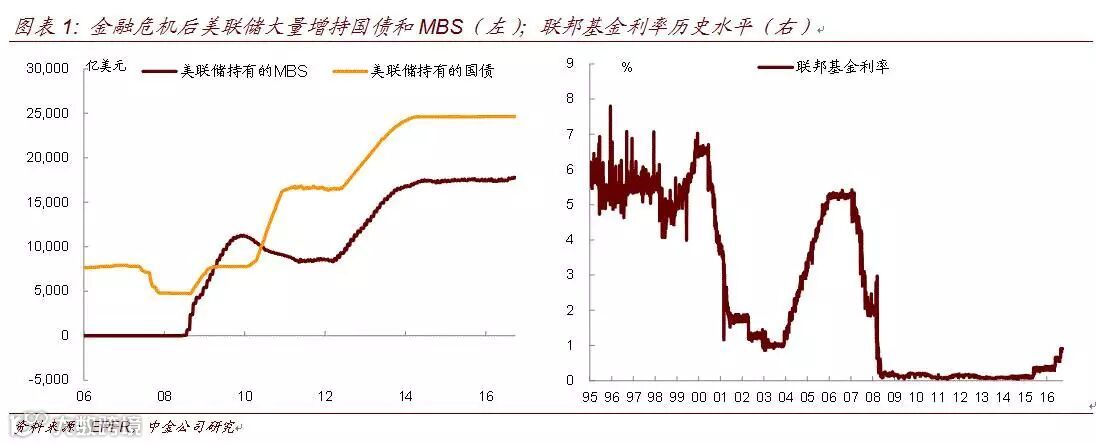 随着美国经济的复苏,目前美联储开启了货币政策正常化进程。美联储在14年9月发布的《Policy Normalization Principles andPlans》中明确提到,货币政策正常化分两步走,第一步是加息,第二步是收缩资产负债表。加息和缩表均是实施紧缩货币政策的方式,其中加息主要是通过公开市场操作直接抬升短端利率,缩表则是通过抛售所持债券或停止到期债券再投资的方式来出售长期资产,实现长期流动性的回收。从影响上来说,加息更多的影响的是短端利率,而缩表更多的影响长端利率。从严厉程度来说,加息是通过抬升价格(短端利率)来抑制贷款活动,相对较为温和,而缩表则是直接通过“量”来影响市场,直接缩减基础货币的供给,是一种更为严厉的紧缩政策。正是因为缩表对市场的冲击更大,所以大部分联储官员均表示需要等到利率抬升到一定程度后才会考虑缩表,且加息和缩表不会并行。但是对于加息到何种程度开始缩表,美联储并没有给出明确的意见。从联邦基金利率的历史水平来看,目前联邦基金利率处于历史偏低水平,至少需要达到1.5%-2%的水平才能达到2000年以来的上一轮低点。目前联邦基金目标利率水平在1%,按照每次加息25bp的速度来看,至少需要再加息两次后联储才会开始启动缩表。