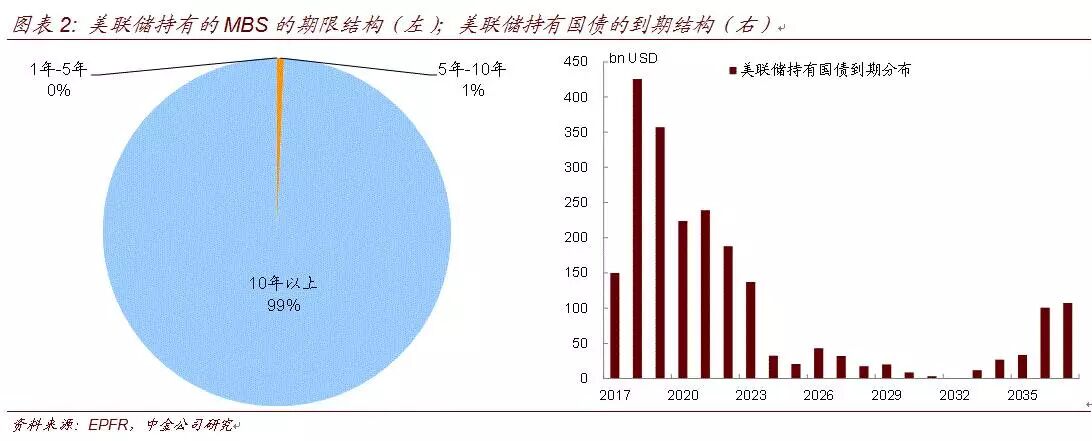 目前美联储资产负债表中的资产主要是国债和MBS,从下图可以看出,美联储持有的MBS大多集中在10Y以后到期,而且美联储主动抛售MBS来缩表的可能性也较低。如果美联储大量减持MBS,必然会造成MBS利率的上行,按揭贷款利率也将随之上行。金融危机后美国的此轮经济复苏与房地产市场密不可分,如果美联储在此时大量抛售MBS,必将对房地产市场造成较大影响,也会影响美国经济的进一步复苏。