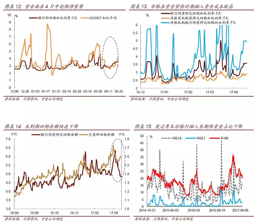 未到期回购余额方面,近期在资金面趋紧叠加银监会发布一系列监管文件,引导金融去杠杆的背景下,未到期回购余额快速下行。银行间未到期回购余额从4月初的6.35万亿快速降至目前的4.8万亿,交易所未到期回购余额也快速降至1.6万亿以下。从融入资金期限来看,度过季末后机构融入长期限资金资金比重较前期有所下降,但受上周资金面偏紧影响,长期限资金融入占比仍较同期偏高。