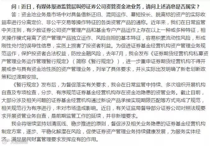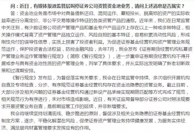 三是强调,截止目前,大部分涉及相关问题的证券基金经营机构通过新设产品承接实现期限匹配等方式完成了规范,相关规范行为有序进行,未对市场造成影响。近日,有关证监局督导部分证券公司对照法规要求开展资管业务自查,是前期监管工作的延续,并非新增要求。