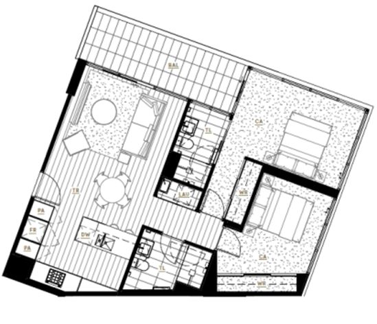 这套2卧2卫总面积83平方米(实际使用面积,等同中国的建筑面积单位110平方米)的公寓位于B栋8楼,东北朝向(南半球澳洲最好的朝向),既能享受一年四季充足的阳光,冬暖夏凉,更能饱览环绕流经的亚拉河和对岸郁郁葱葱的公园绿地和高尔夫球场。