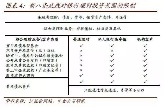 银行理财新规对银行理财投资范围的限制:新规下不同类型理财投资范围总结如图表1所示。基础类理财可以投资于银行存款、大额存单、国债、地方政府债券、中央银行票据、政府机构债券、金融债券、公司信用类债券、信贷资产支持证券、货币市场基金、债券型基金等资产,均是标准固定收益类资产。而综合类理财则在基础类业务范围基础上,还可以投资于非标准化债权资产、权益类资产和银监会认可的其他资产。但是普通个人理财产品不能投资于除货基和债基以外的基金,不得投资于权益类资产,而私人银行高净值客户以及机构理财产品除外。此外,所有银行理财产品不得直接或间接投资于本行信贷资产及其受(收)益权,不得投资于本行发行的理财产品。商业银行面向非机构客户发行的理财产品不得直接或间接投资于不良资产及其受(收)益权。标准化资产投资方面,增加双10%要求,每只理财产品持有一家机构发行的所有证券市值不得超过该理财产品余额的10%;商业银行全部理财产品持有一家机构发行的证券市值,不得超过该证券市值的10%。国债等除外。最后,银行理财的非标投资只能对接信托,不得通过券商资管和基金专户等通道。