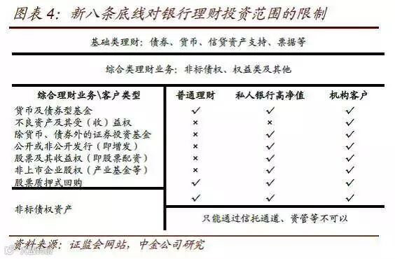 银行理财:分为基础类和综合类,只有满足资本净额不低于50亿元人民币、最近3年无严重违法违规行为和因内部管理问题导致的重大案件等条件,才能申请成为综合类银行理财。但是目前征求意见稿并没有出台针对存量银行理财如何处理的规定,我们预计会新老划断或给与较长过渡期。