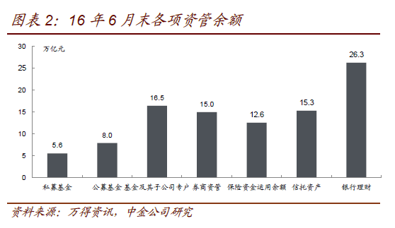 虽然由于流动性错配和竞争同质性特征的存在,理财本身很难实现主动的规模收缩和去杠杆。但16年以来监管层关于金融去杠杆的政策层出不穷,最终会加大理财提升收益的难度,从而可能使得理财规模增长难度进一步加大,去杠杆的速度也可能加快。由于理财在期限和流动性上显著错配,天然具有规模只能增不能减的刚性特征。再加上不同银行理财同质性特征很强,竞争过程中容易陷入囚徒困境,因此如不出现显著的外力因素压制,理财本身很难实现主动的规模收缩和去杠杆。但需要注意的是进入2016年之后,监管机构对金融风险的关注度越来越多。其背景主要是2014年以来大资管兴起,银行理财、券商资管、基金专户和子公司管理规模爆发式增长(图表2)。尤其是去年6月份“股灾”之后,高收益资产越来越稀缺,期限错配、资金池、加杠杆以及产品嵌套等现象在泛资管领域非常普遍,加剧了金融风险的传染性以及系统脆弱性。为了防范相关风险,防止资金脱实向虚,2016年以来一行三会统一行动,对票据、信贷资产收益权、保险资管、券商资管、基金子公司以及银行理财出台了多项监管政策。