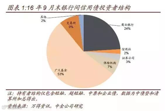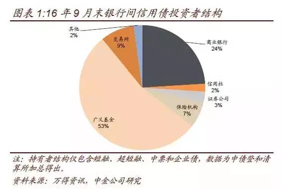 2012年起伴随金融脱媒化,以银行理财为代表的大资管类投资者在信用债持有者结构中的占比越来越高,目前已经过半。去年8月末,商业银行与广义基金对存量银行间信用债的持仓占比分别为39%和37%,虽在伯仲之间,但商业银行(自营)仍是信用债最大持有者。自15年四季度开始,广义基金持仓占比开始超过商业银行,成为信用债最主要的投资者群体。截至16年9月末的最新数据,广义基金和商业银行的持仓占比分别为53%和24%。(图表1,由于公司债不披露持有者结构,上述数据未包含公司债。不过由于商业银行较少直接参与交易所市场,如果考虑公司债的话,大资管投资者的市场占有率还会更高。)
