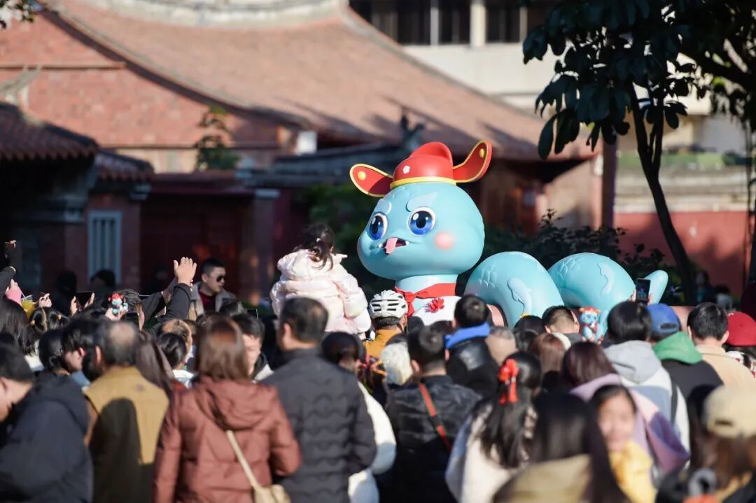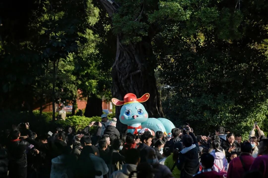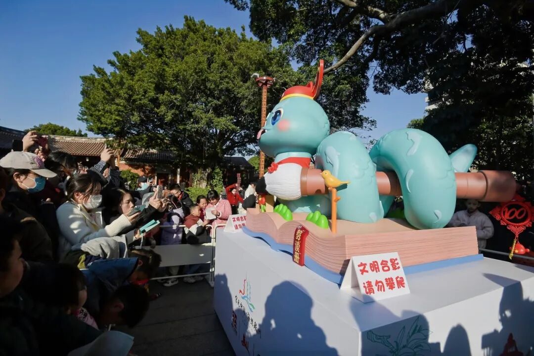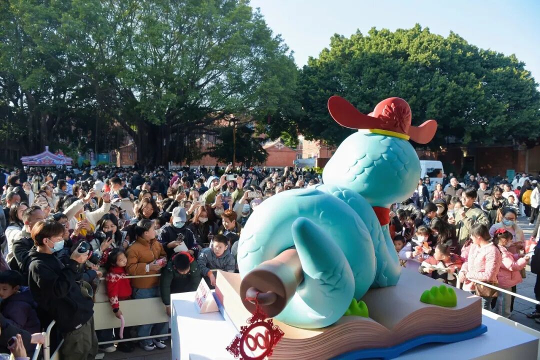 下午3时许,泉州府文庙广场人头攒动,场面热闹非凡,欢欢在众人的热烈迎接下抵达现场。只见欢欢通体古韵青色,头戴缀有刺桐花的状元帽,蛇身卷持毛笔,脖系红领巾,整体造型呈“100分”样,“靛衣蓝带,妙笔生花”,在泉城学子期末备考之时,状元蛇“欢欢”在古代泉州的最高学府——泉州府文庙出场,向众人传达“敖读册”的好学之运,预祝各位学子可以考出好成绩!