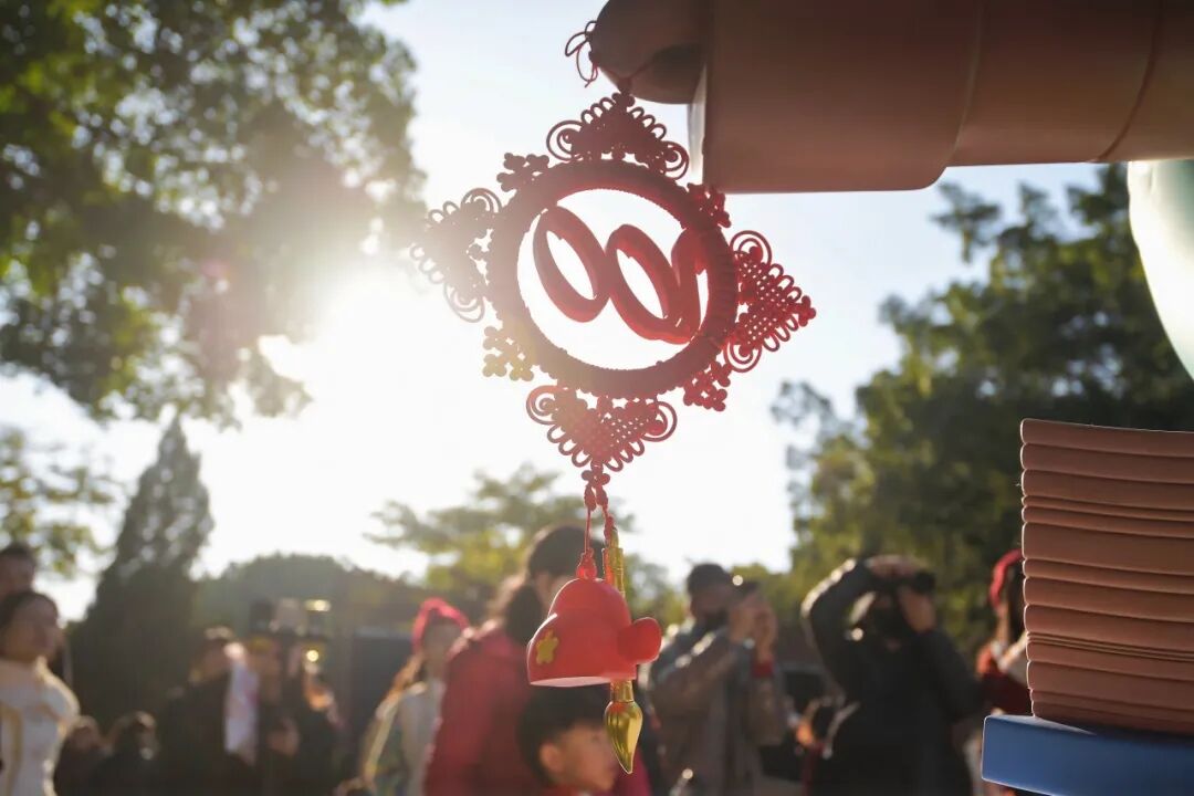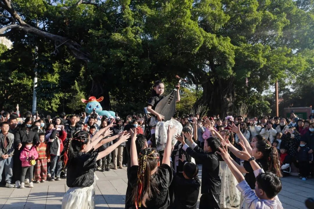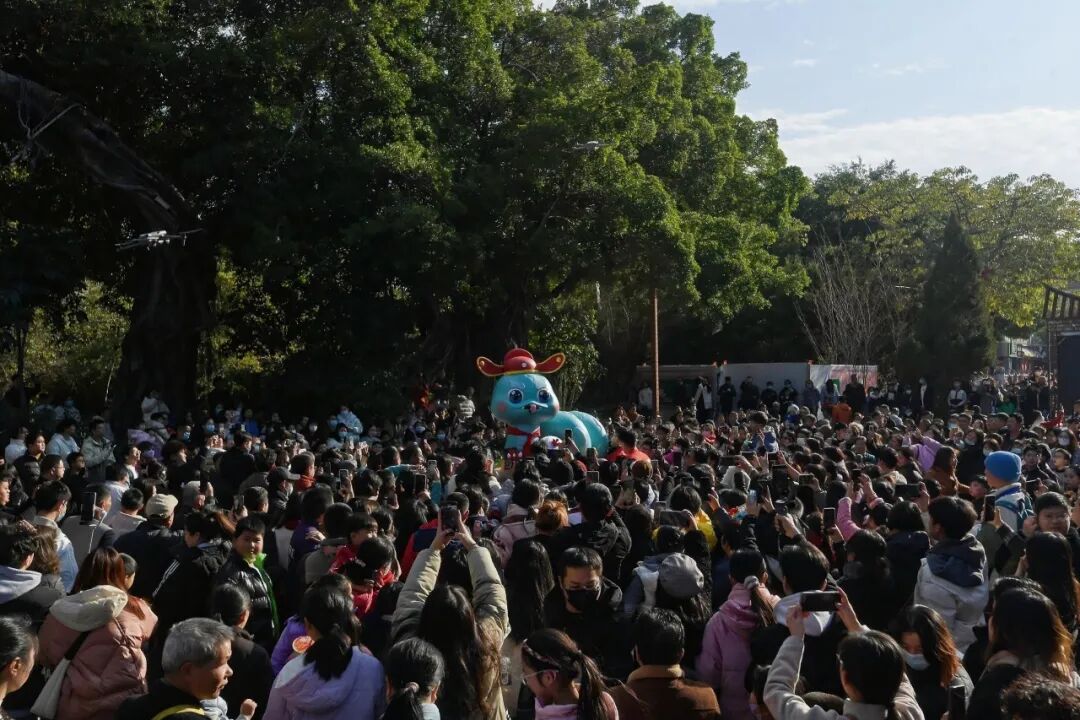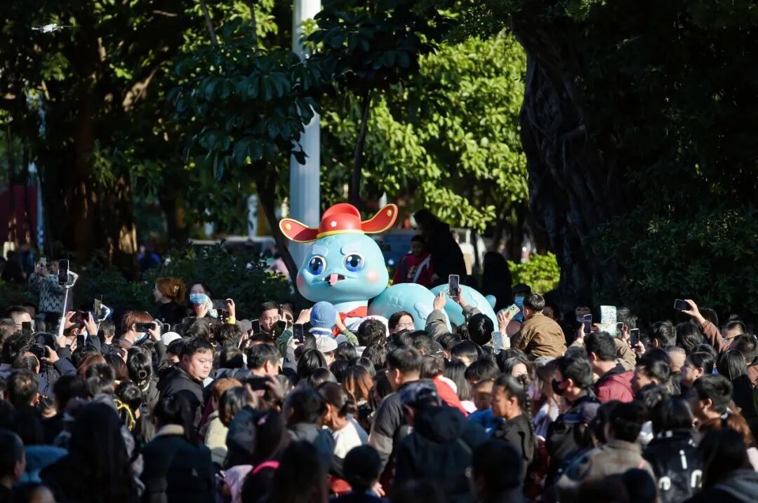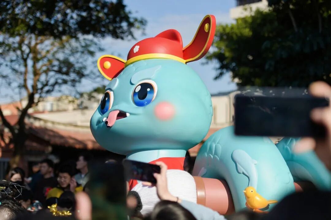 下午3时许,泉州府文庙广场人头攒动,场面热闹非凡,欢欢在众人的热烈迎接下抵达现场。只见欢欢通体古韵青色,头戴缀有刺桐花的状元帽,蛇身卷持毛笔,脖系红领巾,整体造型呈“100分”样,“靛衣蓝带,妙笔生花”,在泉城学子期末备考之时,状元蛇“欢欢”在古代泉州的最高学府——泉州府文庙出场,向众人传达“敖读册”的好学之运,预祝各位学子可以考出好成绩!