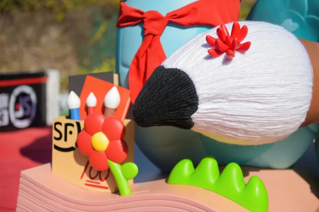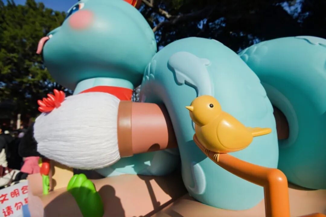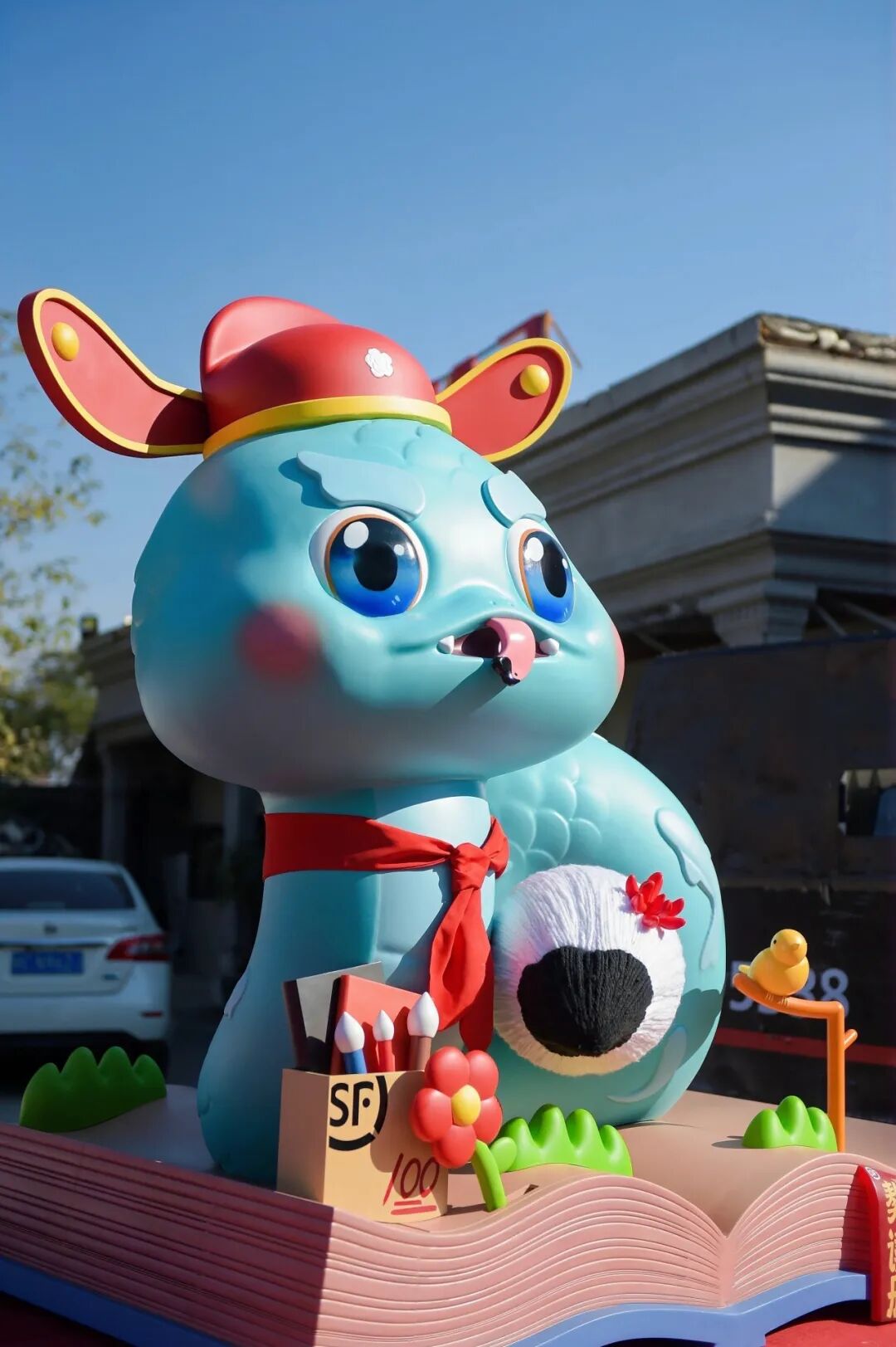 欢欢的整体造型也有巧思设计,蜿蜒的蛇身形如江河川流不息,身上的锦鲤皮肤和若隐若现的鳞片,象征“锦鲤附体、鱼跃龙门”,整体走势为向上,也同样代表着“天天向上”;蛇身上佩戴着红领巾,也象征着欢欢正如祖国的花朵蓬勃向上、活力满满。