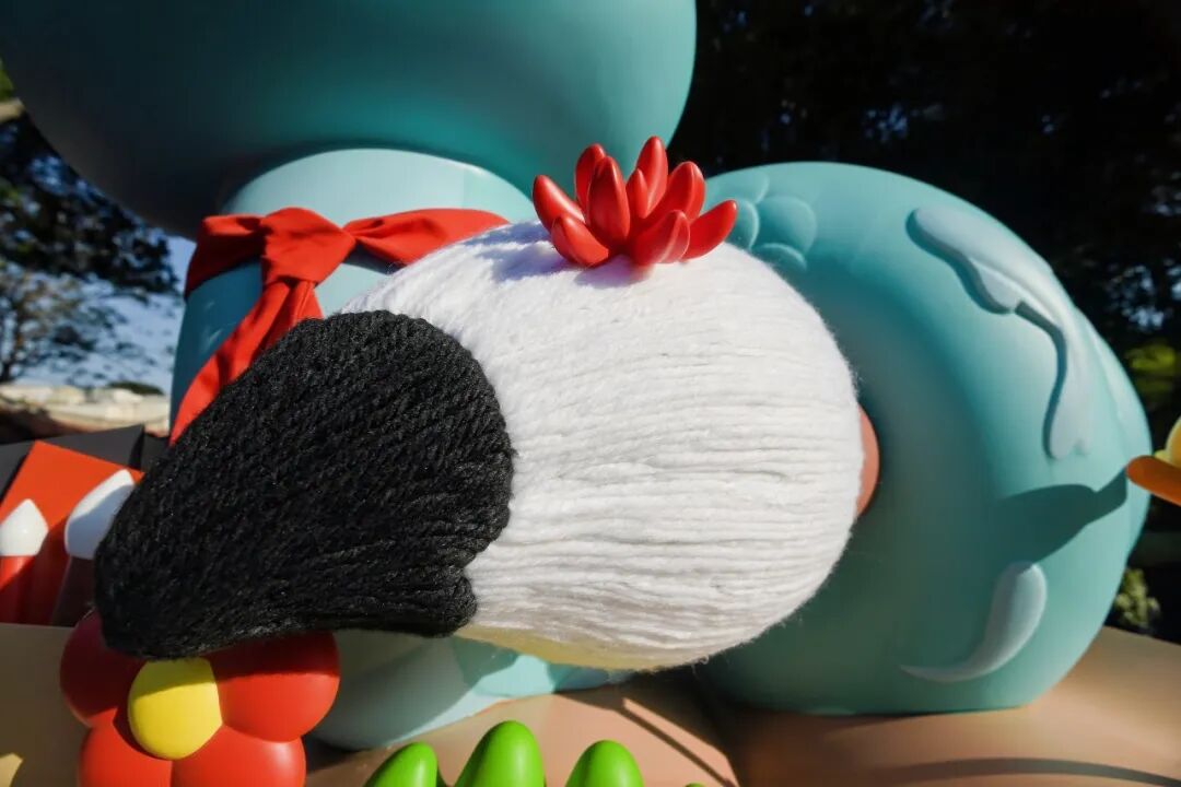 除此之外,欢欢的底座造型也有巧思,为一本打开的书,蛇卧于书本之上,取意“书虫”;书前的花朵装置左右摇动,仿佛在随风摇曳,书上的小草也形若一座小笔架山,书中还藏有一个“敖读册”的书签;整体氛围清新淡雅,灵感取自宋末文人翁森所作《四时读书乐》之《春》: