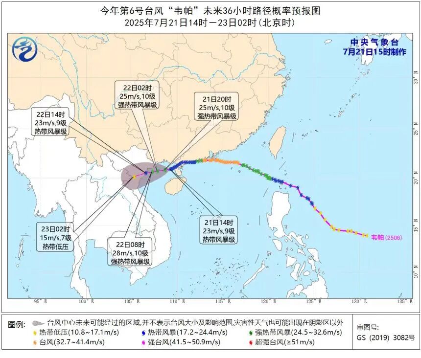 今年第6号台风“韦帕”已于20日17时50分以台风级在广东省台山市沿海登陆,今天(21日)16时其中心位于北部湾海面,中心附近最大风力9级(23米/秒)。预计,“韦帕”将以每小时10-15公里的速度向偏西方向移动,强度还将有所增强,22日下午到夜间将在越南北部沿海再次登陆(附图1)。