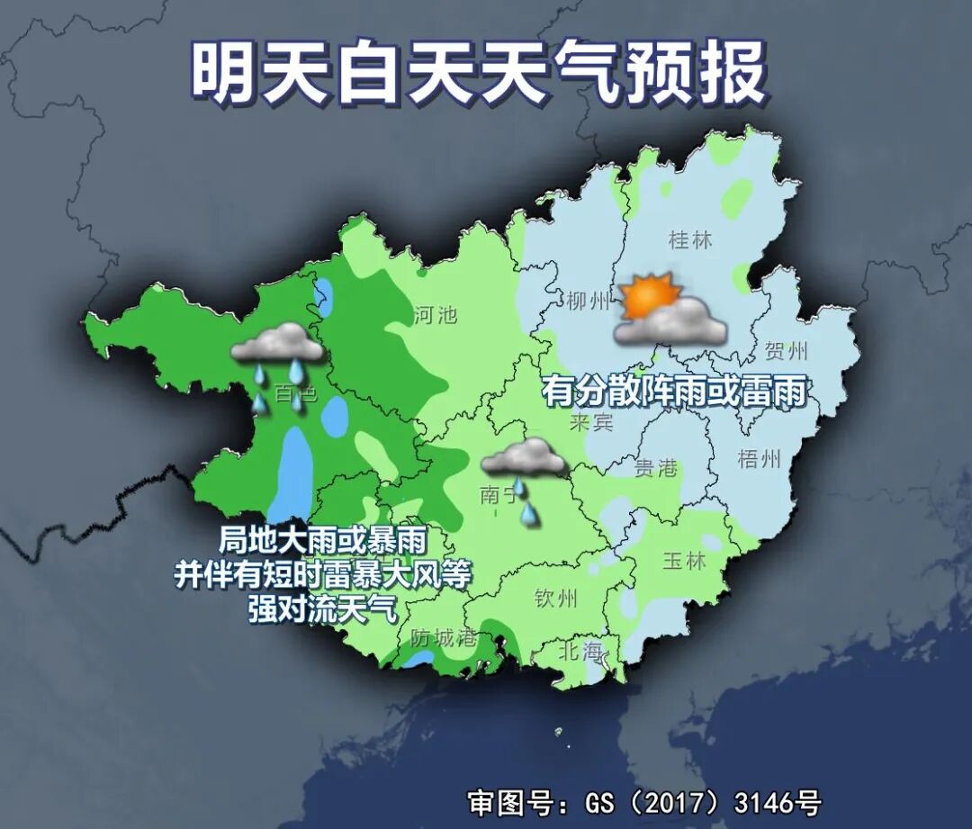 1.今晚到明天桂西及沿海局地有暴雨或大暴雨和强对流天气,仍需加强防范强降雨可能引发的山洪、地质灾害、中小河流洪水、城乡积涝。强降雨、强对流天气期间尽量减少外出,切勿在树木、高塔、电线杆、广告牌、临时搭建物下方停留,同时务必远离河道、地势低洼易涝区、地质灾害易发区等。