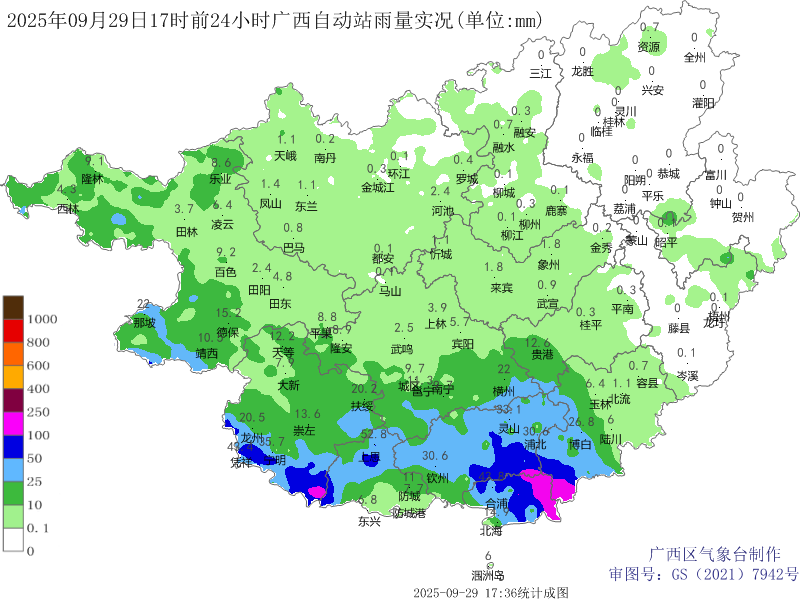 最大雨量出现在玉林市博白县大坝镇