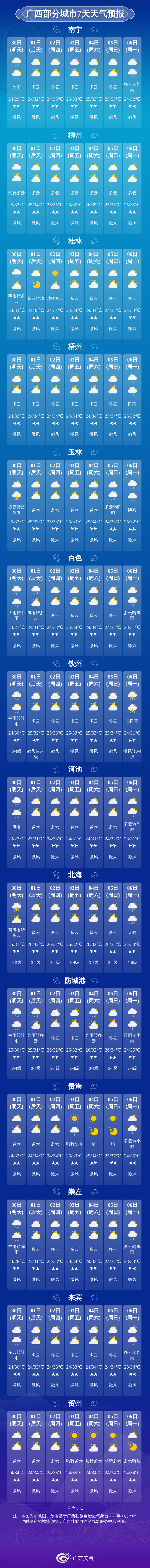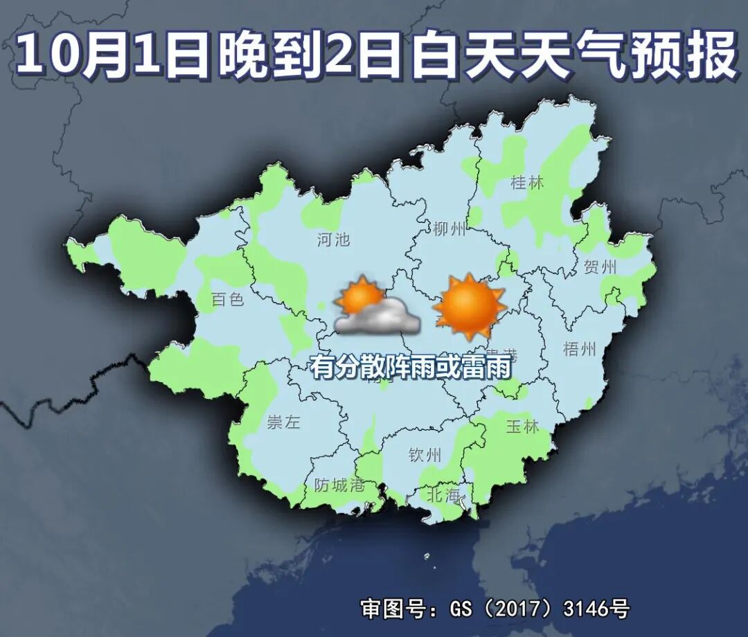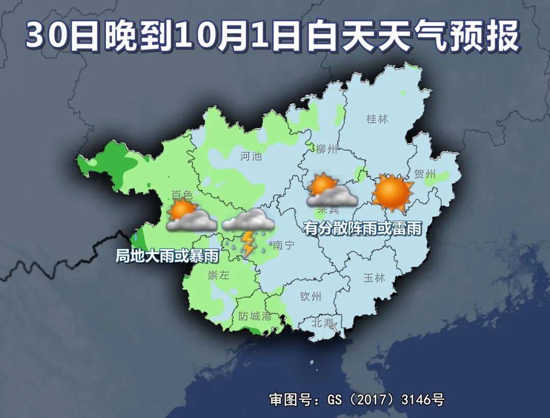 30日晚上到10月1日白天,桂西多云有阵雨或雷雨、局地大雨或暴雨,桂东多云间晴有分散阵雨或雷雨。