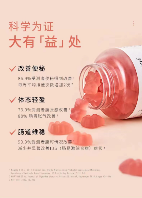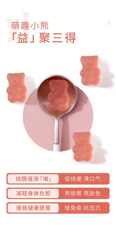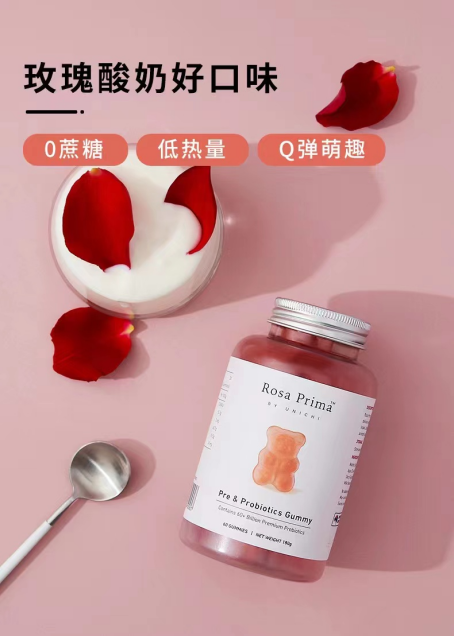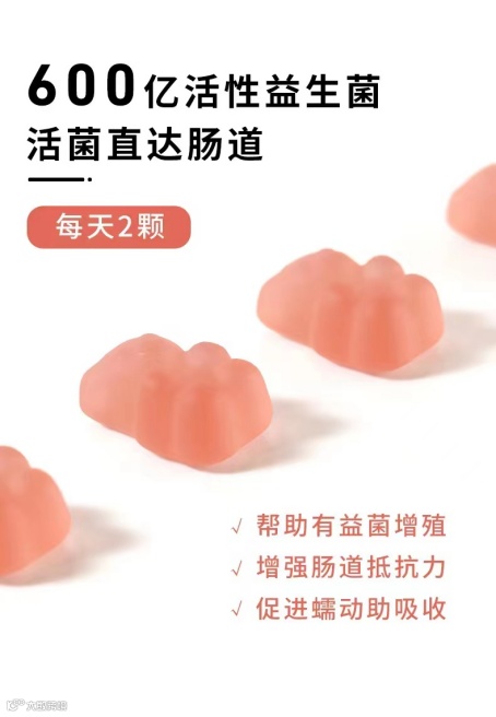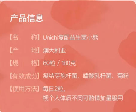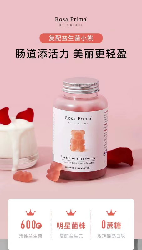 Unichi益生菌小熊---粉粉的颜色,真的好可爱!能够维稳健康肠胃,轻体好吸收。Unichi益生菌胶原小熊使用明星菌株复配益生元的明星复配配方,融汇600亿活性益生菌,选择稳定耐酸耐盐耐高温明星菌株:嗜酸乳杆菌DDS-1,凝结芽孢杆菌,存活率高达90%。