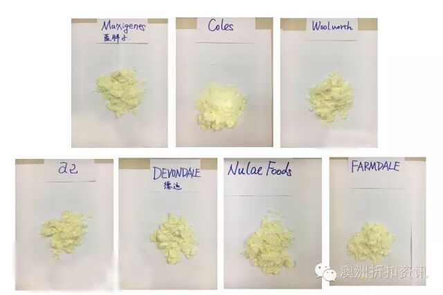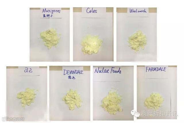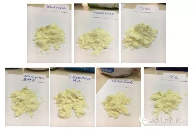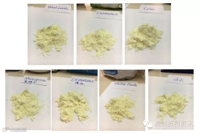 粉质最细的是Nulac Foods,最粗的是蓝胖子、Woolworth;奶味方面,Nulac Foods最纯,FARMDALE最香,蓝胖子奶味浓,a2、德运较清淡,Woolworth、Coles奶味不纯有怪味。