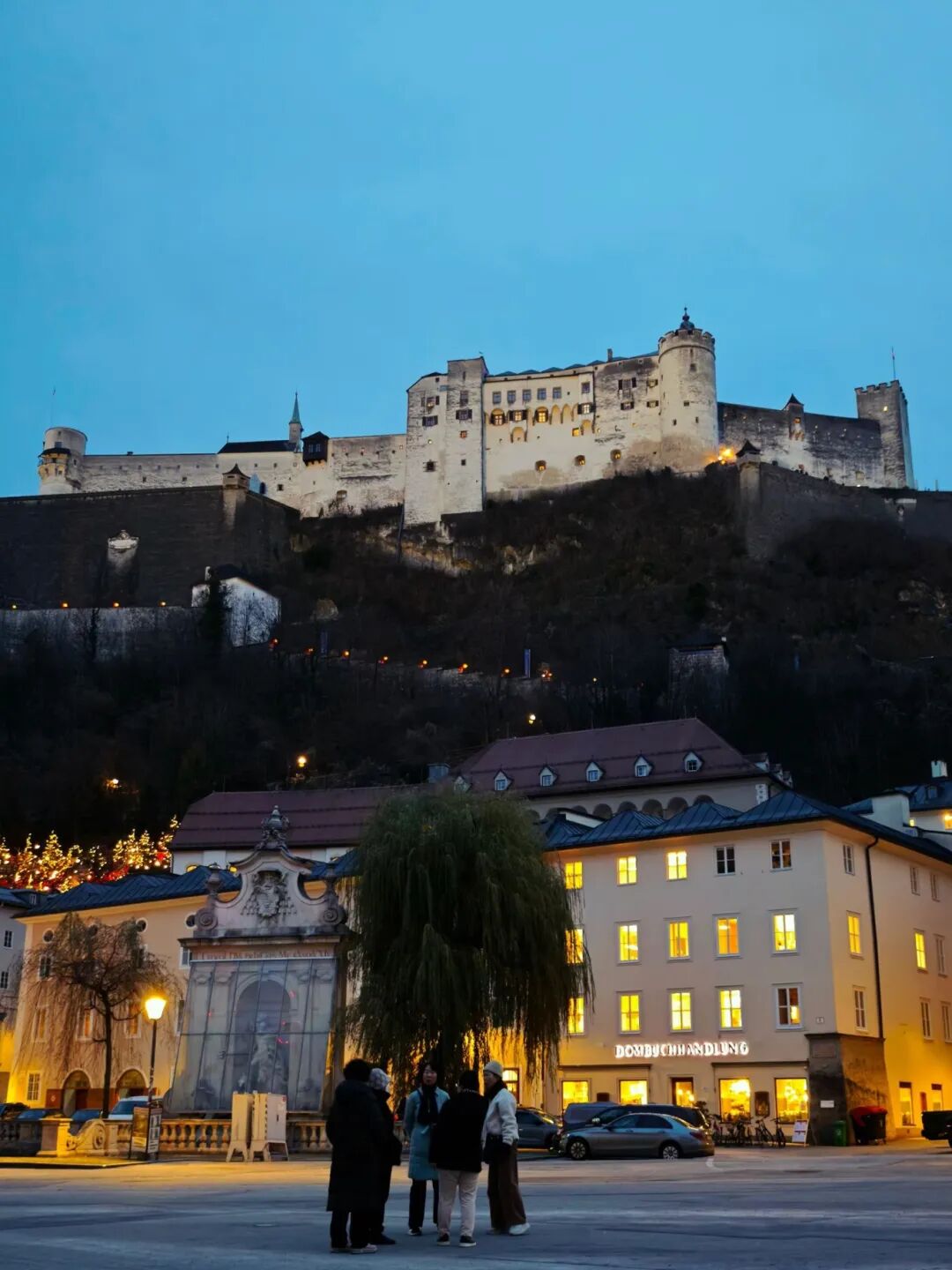 队伍乘小火车登顶从未被攻克的萨尔茨堡要塞。立于城堡之巅,红顶老城与蜿蜒盐河尽收眼底。当夜幕降临,灯光亮起,整座城堡宛如悬浮于空中的童话之城,为这一天画上浪漫的句点。