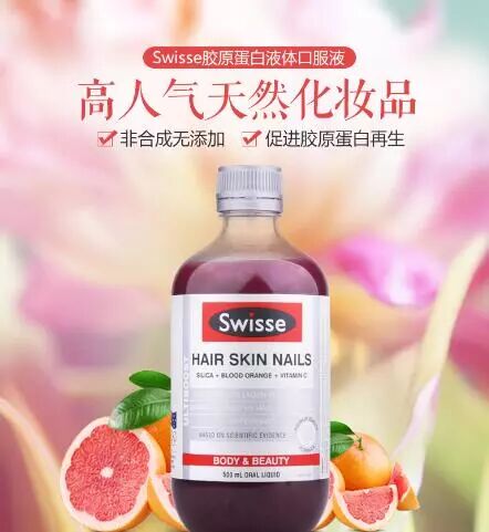 Swisse胶原蛋白液内含维生素C和二氧化硅可以促进人体内胶原蛋白再生。人体自身产生的胶原蛋白才是健康的,安全的,有效的。产品由天然血橙提取,含有丰富的维生素补充身体营养物质。服用后使人漂亮、水嫩、白皙、丰满有气质。