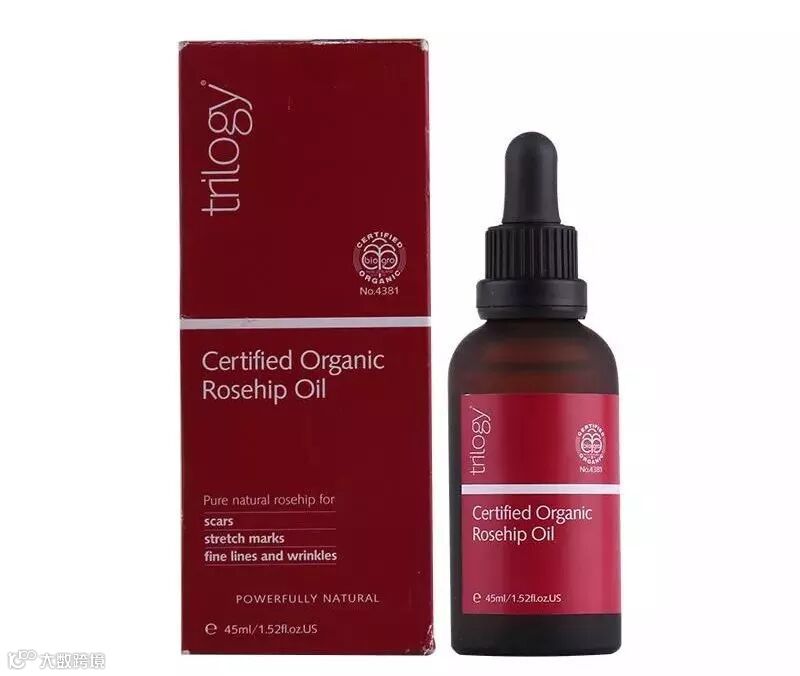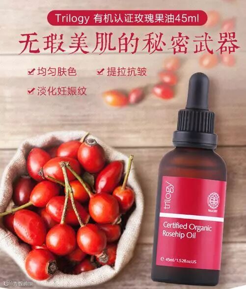 Trilogy有机玫瑰果油是100%有机野玫瑰果油具有强化组织功效,容易渗透到真皮层,适合任何肤质,特别适合缺水、晒伤、出现斑点、成熟以及老化肌肤,对淡化色斑、重现均匀色调和增加肌肤弹性有很好作用,包括像淡化/消除疤痕,皱纹、妊娠纹、肥胖纹、干纹、痘印等。