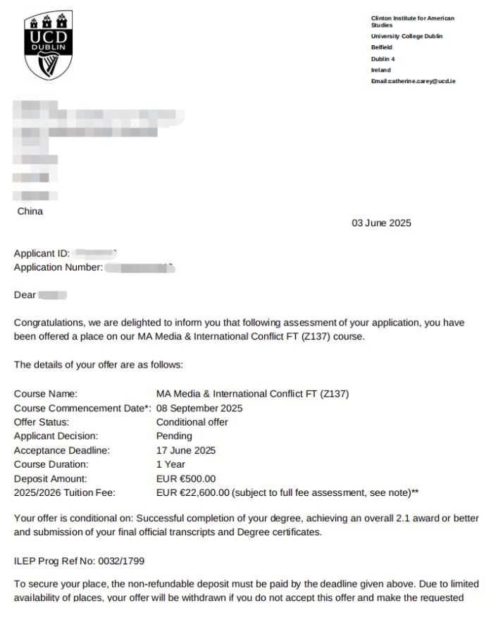 🌟OFFER:爱尔兰都柏林大学媒体与国际冲突文学硕士