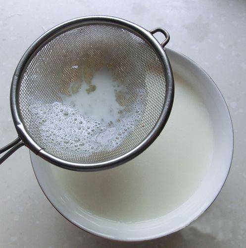 3、过滤牛奶,主要是为了过滤没化开的琼脂,然后趁热倒入小容器里,这个天气很凉,所以很快就冻住了。