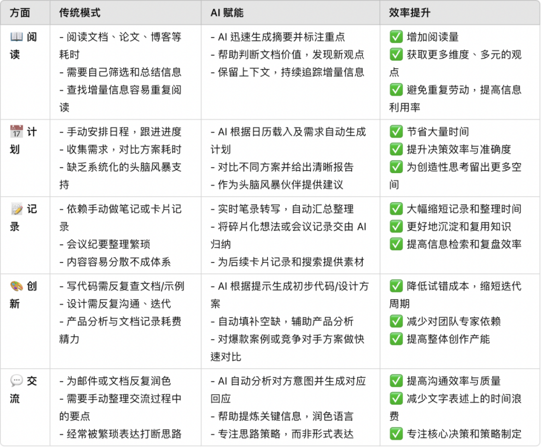 总体而言,在阅读、计划、记录、创作和交流这五⼤环节,AI都显著提升了我在单位时间的产能,减少我被打断或陷于细节的精⼒消耗,并节省我⼤量体⼒⼯作。