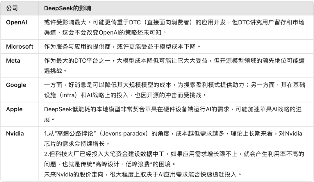 DeepSeek的异军突起,对美国科技大厂,会造成不同程度的震荡或影响。下面,我用AI做张简单的图表来更加直观地展示。
