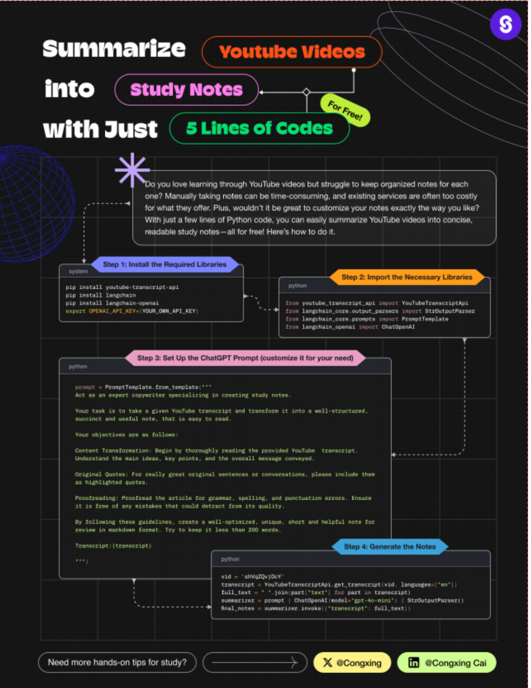在AI的协助下,我曾经发布了⼀个5⾏代码摘要YouTube视频的Post(帖子),如下图: