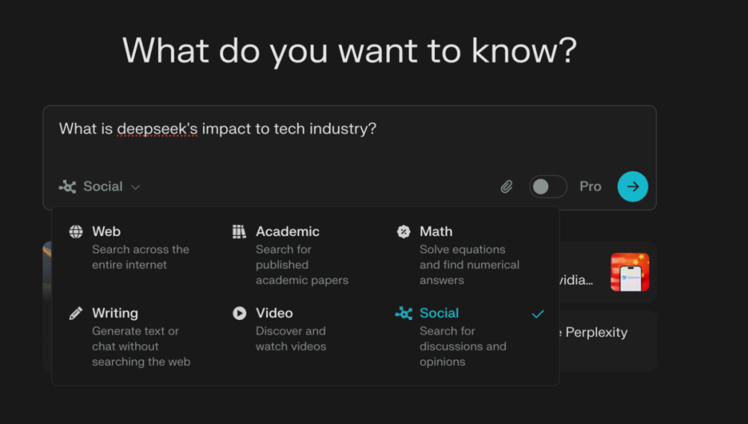 在这里,我推荐自己在用的搜索⼯具Perplexity.AI,如下图。相比其他AI工具,它更擅长聚合不同观点、提供更全⾯的调研分析,⽽不只是给出“最相关结果”。