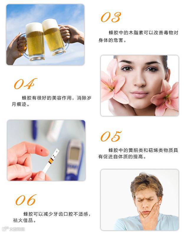 一些糖尿病患者坚持服用蜂胶制剂,4周后四肢发麻现象逐步消失:1-2月后,血脂显著降低。