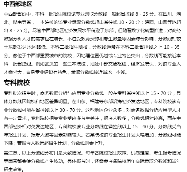 北京、上海、浙江、江苏、广东等地,本科一批招生院校的商务数据分析与应用专业,录取分数线通常超本科一批省控线 15 - 35 分。以上海为例,部分知名高校该专业录取分数线超出一本线 20 - 30 分;广东部分高校超出省控线 15 - 35 分。这些地区经济发展迅猛,对商务数据分析人才需求旺盛,且教育资源优质,吸引大量优秀考生报考,故而分数线较高。像上海财经大学、复旦大学等重点院校,凭借强大的专业实力与社会声誉,该专业分数线可能超出省控线 35 - 60 分,因其在财经领域地位显著,专业热门,竞争激烈,录取分数线随之攀升。