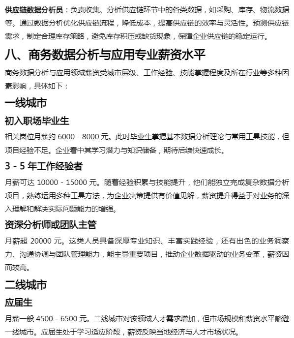 月薪约 3500 - 5000 元。因产业结构单一,对商务数据分析需求有限,企业规模和盈利能力较弱,应届生起薪较低。