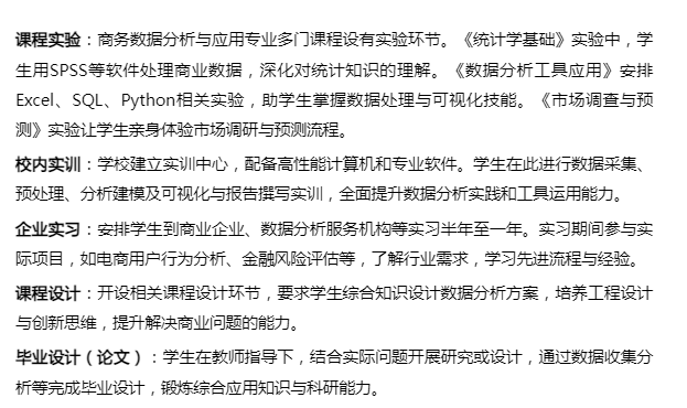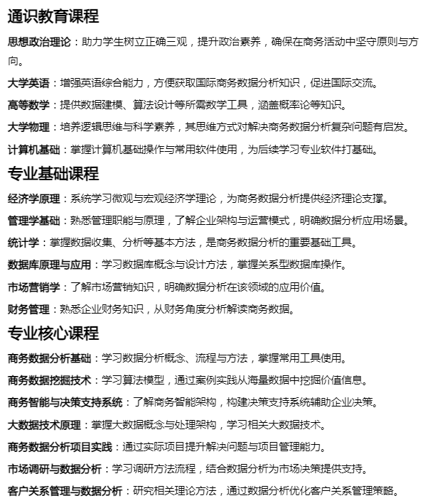 商务数据分析与应用专业的课程体系旨在培养具备扎实理论基础与实践能力的专业人才,涵盖多个课程模块。