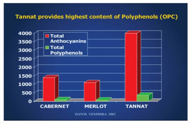 乌拉圭的科学家波耶多(Boido)测量了多种葡萄的原花青素含量,研究结果表明丹拿(Tannat)葡萄中的原花青素含量在所有检测的葡萄中最高,是梅洛(Merlot)葡萄的四倍,赤霞珠(Cabernet)葡萄的三倍。