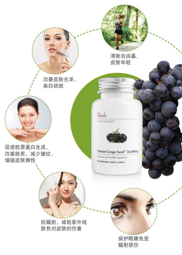 最有效的天然抗氧化剂超级黑葡萄籽丹拿(Tannat)原产自南澳丹拿葡萄园,比普通葡萄籽产品抗氧化能力强上数倍。长期服用,能够有效地防护人体皮肤免受自由基侵袭,改善肤质,美白祛斑。还能抗氧化,抗衰老,保持血管和眼睛的健康。