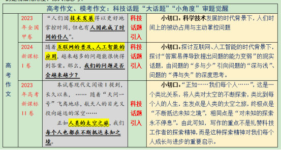 2023年“人们因技术发展得以更好地掌控时间,但也有人因此成了时间的仆人”,题目极为典型,探讨高科技时代人们在时间分配上“科技便利+自主掌控”的平衡性处理问题;2024年高考作文新课标Ⅰ和Ⅱ卷不约而同地以科技话题为母题,或借人工智能引出“问题是否会越来越少”的深度思考,或以探月工程激励青年人“不断抵达未知之境”。