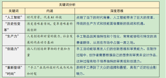 这是一道话题型材料作文。材料第一句表明亲手制作、操作有着积极的意义和作用,肯定了手工劳动所蕴含的意义和价值,为整个材料奠定了对“手工”价值认可的基调。材料第二句“在人工智能引发历史性变革的时代”点明了当下的时代背景人工智能带来了巨大的变革,传统的生产方式和技能面临着新的挑战和机遇,也为“手工”重新登场提供了时代的大舞台;它被赋予了“特别的生产力、创造力”的属性,“重新登场”意味着手工并非全新出现,而是在历史长河中一直存在只是在新的时代又焕发出新的活力,“成为一种时尚”则表明手工得到了大众的追捧和喜爱,具有广泛的社会影响力。(引自“腾远高考作文”)