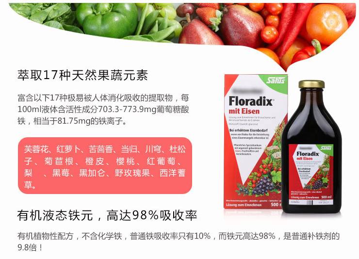 Floradix Formula铁元草本滋补液是全球最受欢迎补铁圣品,强势占据国外65%的补铁市场,是减少4亿女性首选的液态铁,吸收率高达98%,高效补充铁质,有助增加含氧量,有助改善气血循环,帮助孕妇产后排毒。