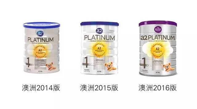 比如,A2奶粉2015年8月更换了一次包装,2016年1月起包装主色调更改为“紫色”,由于奶粉一般保质期在2年左右,因此市面上出现三个版本包装