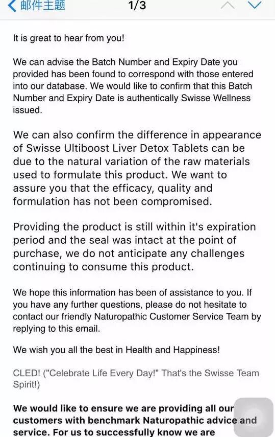 (澳洲Swisse公司回复对各产品包装不同的邮件)