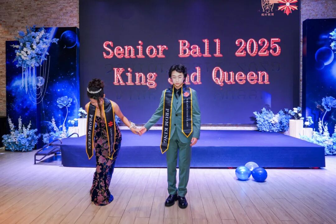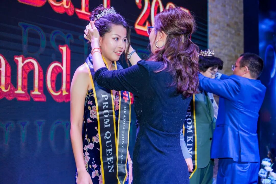 激动人心的 "Prom King & Queen" 票选将舞会推向高潮。经过现场匿名投票,连校长与张总监为当选的两位同学戴上鎏金桂冠与缎面绶带。