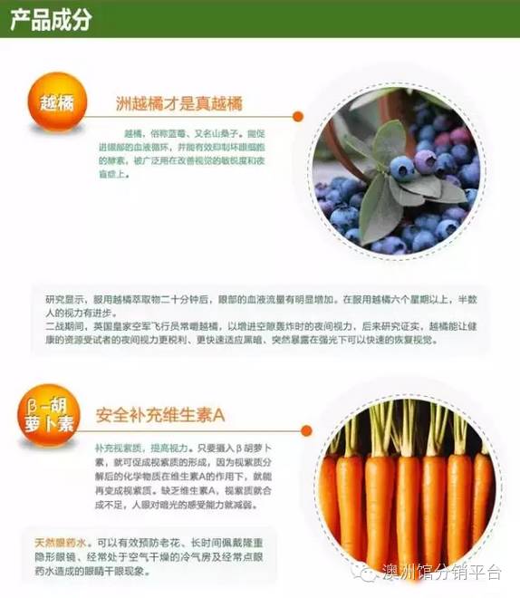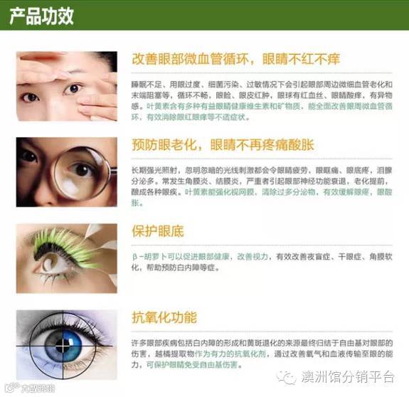 | 功效 | 以保护眼睛,增强视力,预防近视,保持眼睛的色彩分辨,识别细节,保持中央视觉 |