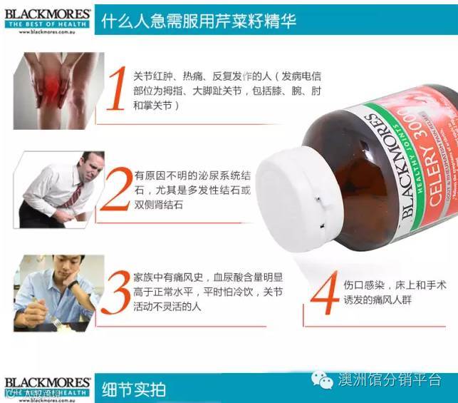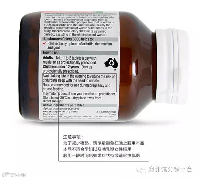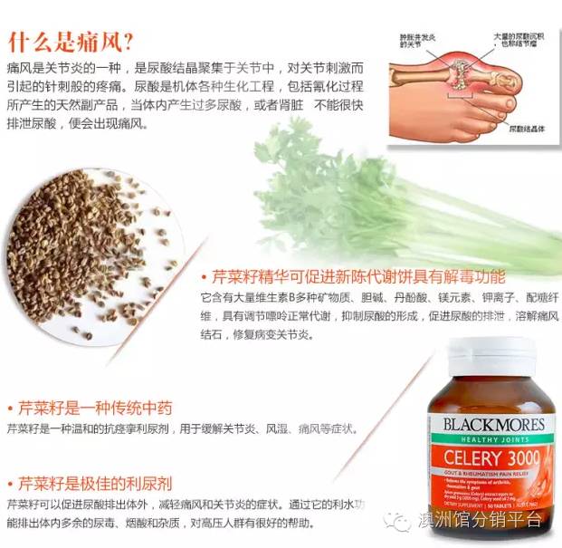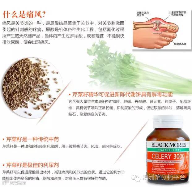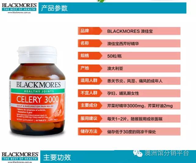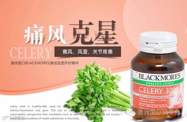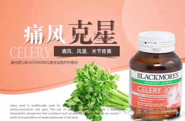 Blackmores Celery 3000 has anti-inflammatory and analgesic activity, as well as significant diuretic properties to support the relief of mild arthritis, rheumatism and gout. 澳佳宝芹菜籽精华具有消炎作用,止痛作用,显著的利尿作用,可缓解轻度关节炎,风湿,以及痛风。