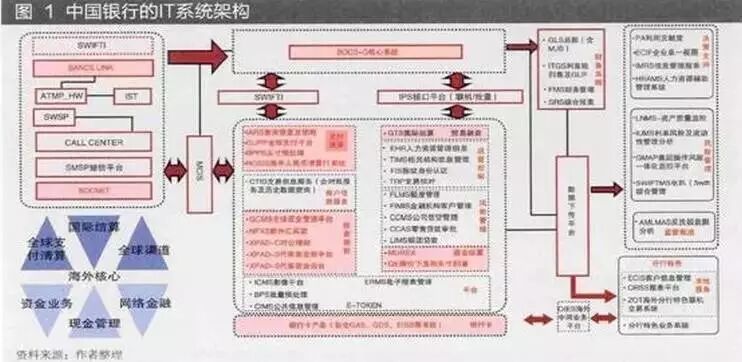 我国商业银行系统,经过几年来的实践和不断优化,形成了各具特色但又统一、完善的技术架构。以下以中国银行的系统架构(见图1),就应对人民币国际化的IT架构应该具备的能力和特点加以具体说明。